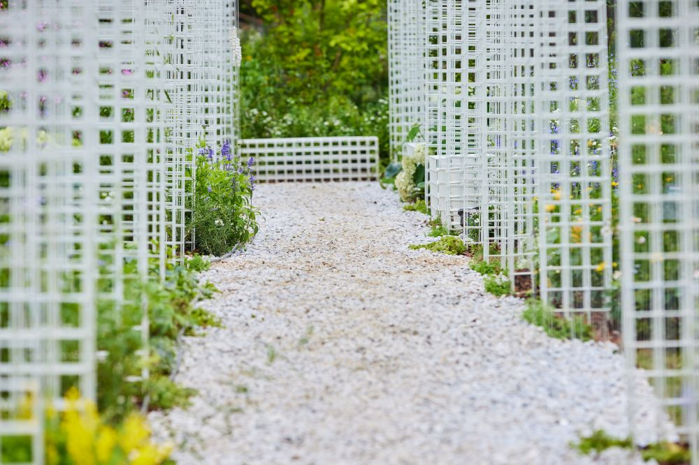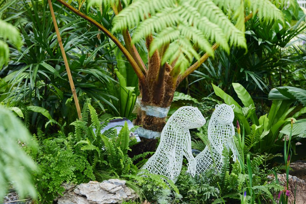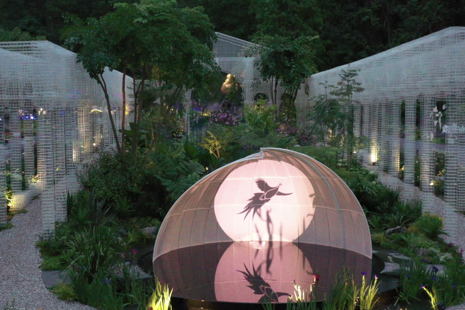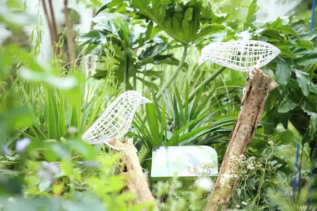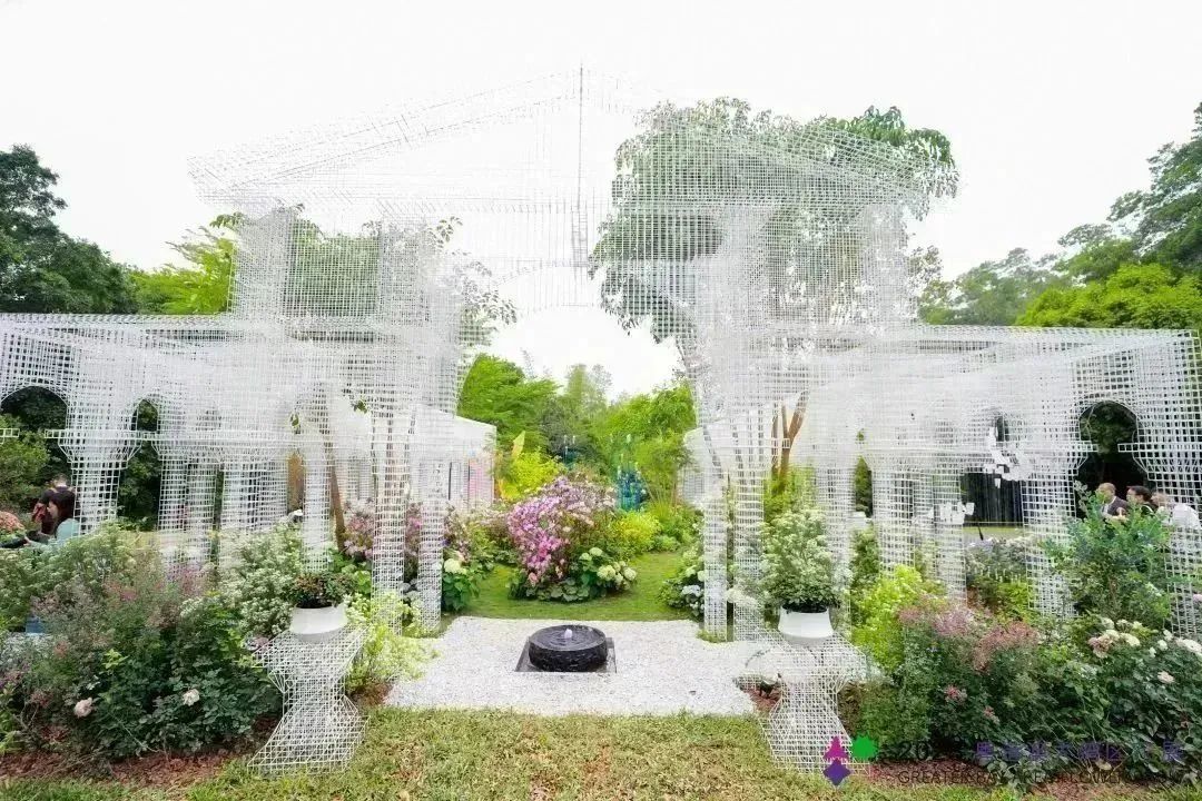 本着资源化、绿色低碳的原则,横琴展园采用环保搭建材料,园内的特色门廊、景观座椅、休闲树池、月洞门等景观构筑物由多种可拆解的金属丝单体构筑而成,不仅带来了独特的艺术美感和互动体验,还能回收再利用,减少材料消耗。