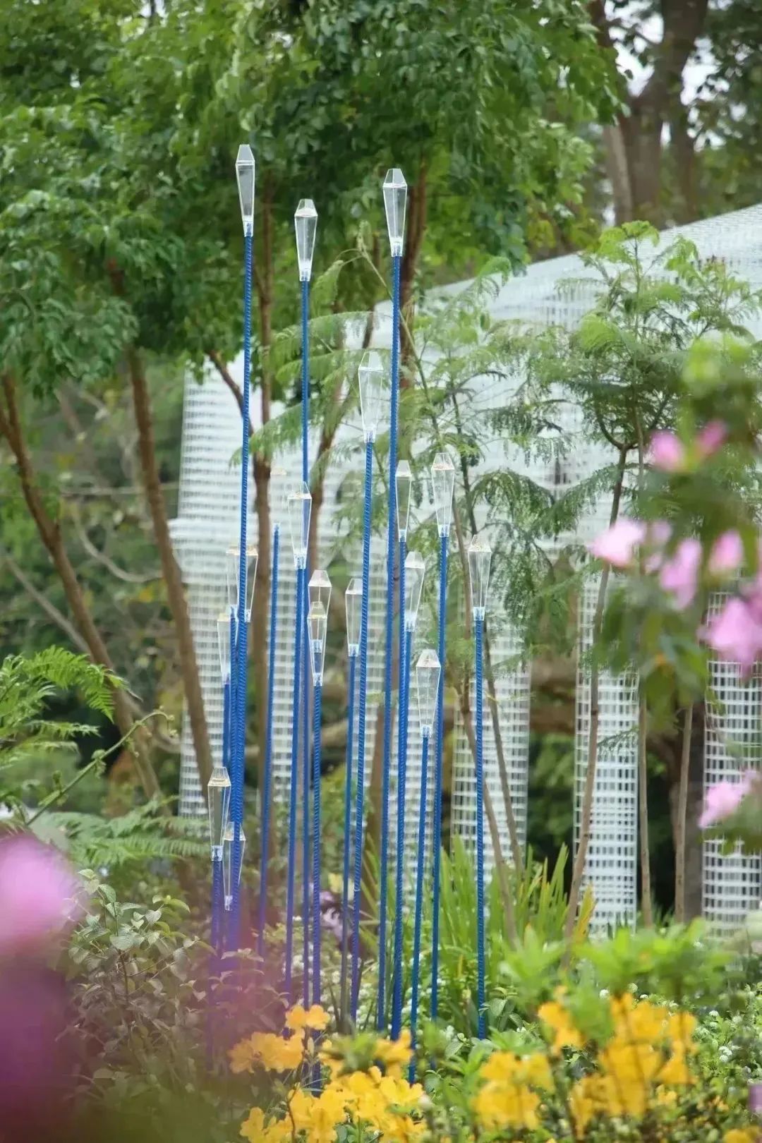 漫步在蜿蜒的小径上,高山杜鹃、花灌木、粘叶豆等各色花卉、乔灌木植物错落分布着,香气宜人。起风时,湖蓝色的竖向立柱在水池中央随风摇摆,营造“长风破浪会有时,直挂云帆济沧海”的氛围意境,寓意粤澳合作乘风远航,精彩纷呈。