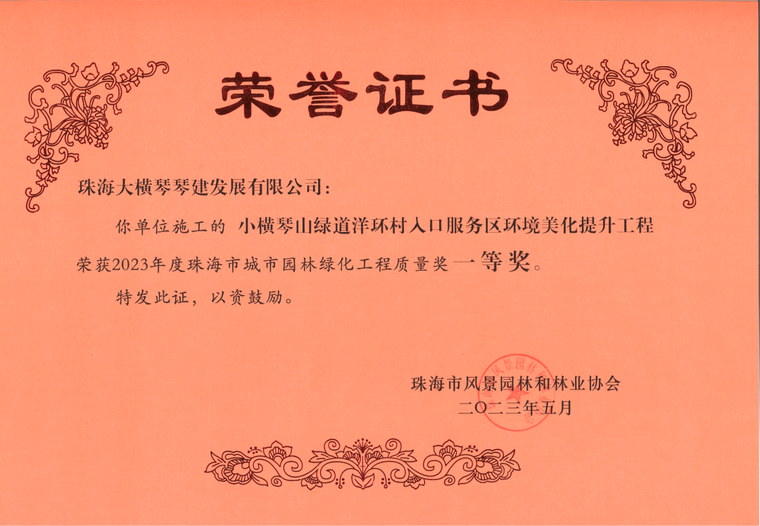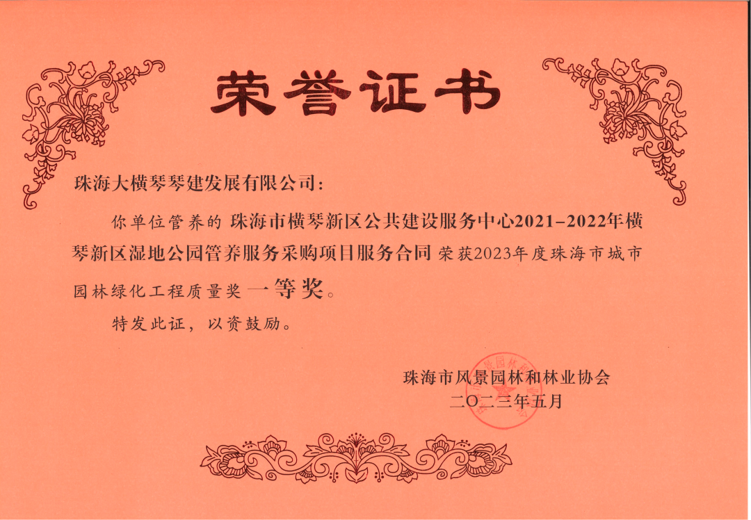 近日,五楼自拍 琴建发展有限公司、珠海市横琴新区公共建设服务中心,2021-2022年横琴新区湿地公园管养服务采购项目服务合同,小横琴山绿道洋环村入口服务区,环境美化提升工程,以及作为代建单位负责建设的古树名木公园(粗沙环)项目,荣获由珠海市风景园林和林业协会颁发的2023年度珠海市城市园林绿化工程质量奖一等奖。
