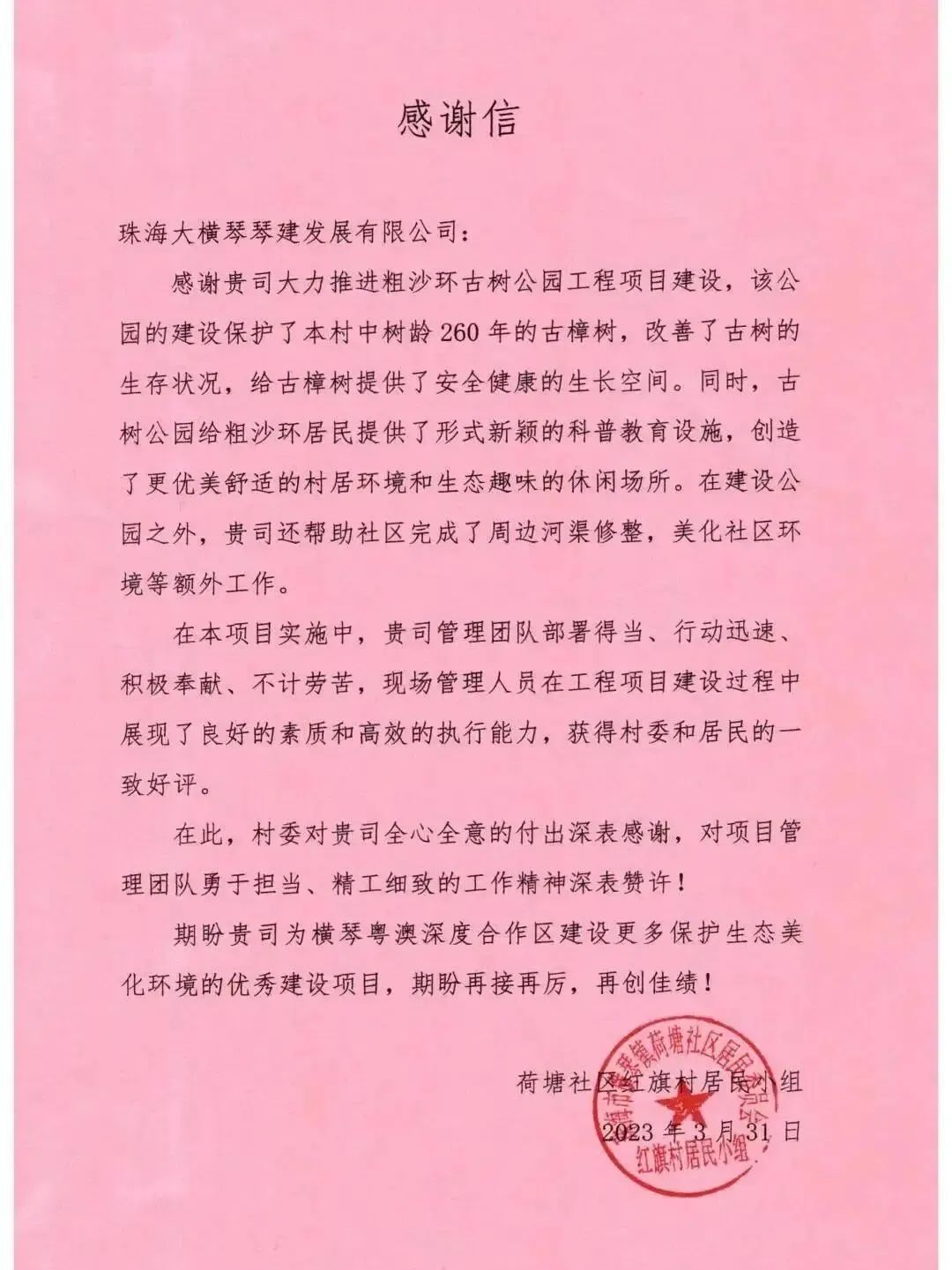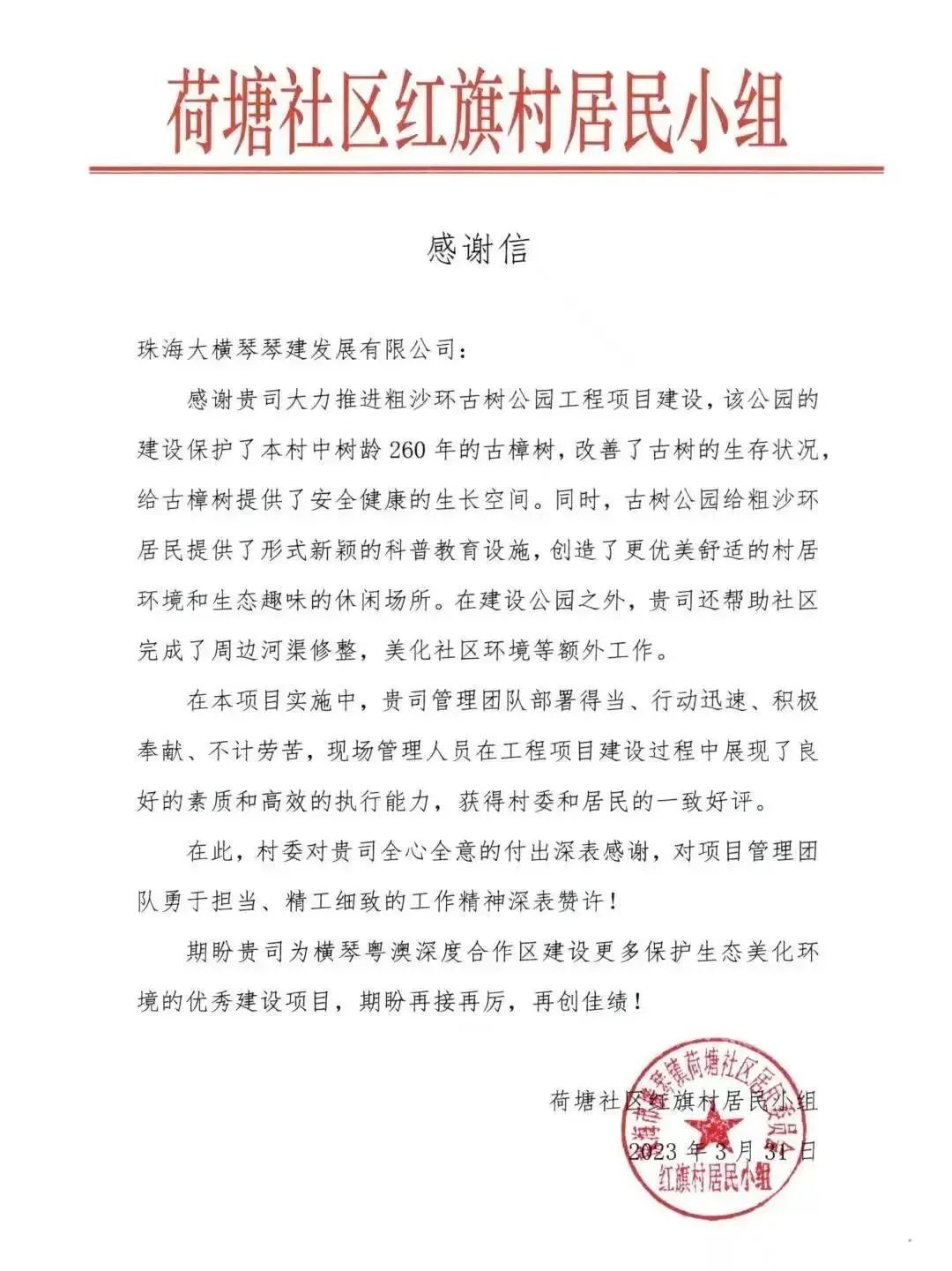 古树公园的建成改善了周边村居环境,也得到了附近村民的喜爱。荷塘社区红旗村居民小组还给琴建公司发来了感谢信。