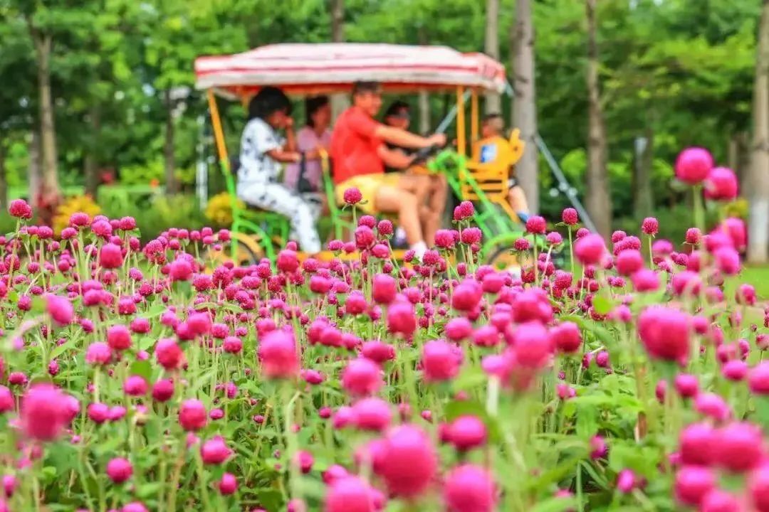 五彩斑斓的时花在花圃中呈现出一幅拼接的撞色彩绘,蜂飞蝶舞,盎然生趣。滨海堤岸景观带上一片繁花似锦、姹紫嫣红。游人在此散步、骑行、拍照打卡,惬意万分。