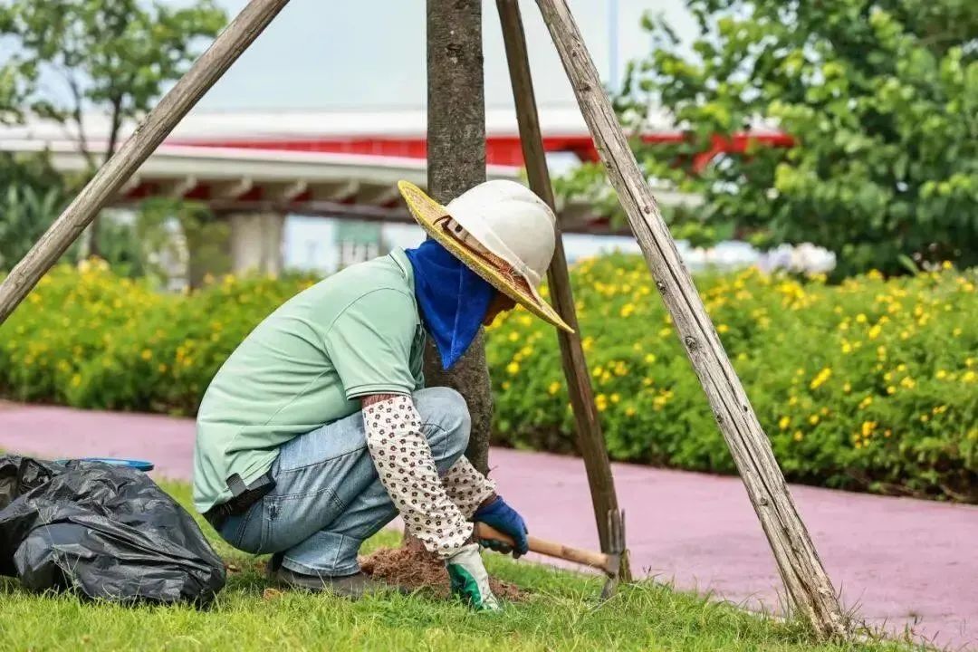 今年三月,琴建公司就对花海长廊三大开花乔木景观区开始了树盘梳理、打孔施肥、喷淋系统修复等工作,在树木管养上做到未雨绸缪,在病虫害防治等日常养护工作之外,提前检查树枝生长情况、及时修剪清理枯枝,防止枯枝掉落砸伤游人,有效预防并减少台风伤害。