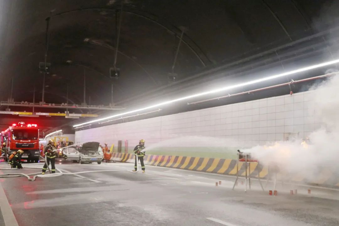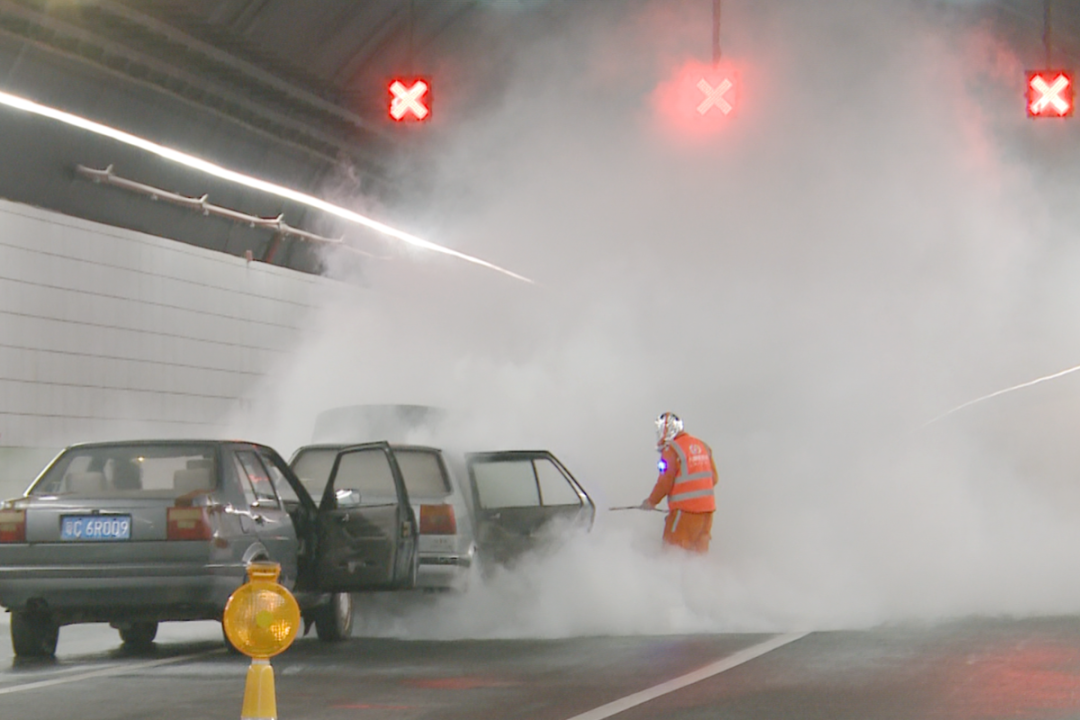 守护安全,分秒必争。隧道运行环境错综复杂,推动“人治”向“智治”转变尤为重要。本次演练增设了消防喷淋系统演练环节,真实呈现系统自动灭火过程。隧道火焰探测器感应到火灾后自主发出告警信息,启动喷淋系统灭火,做到安全、迅速、及时。