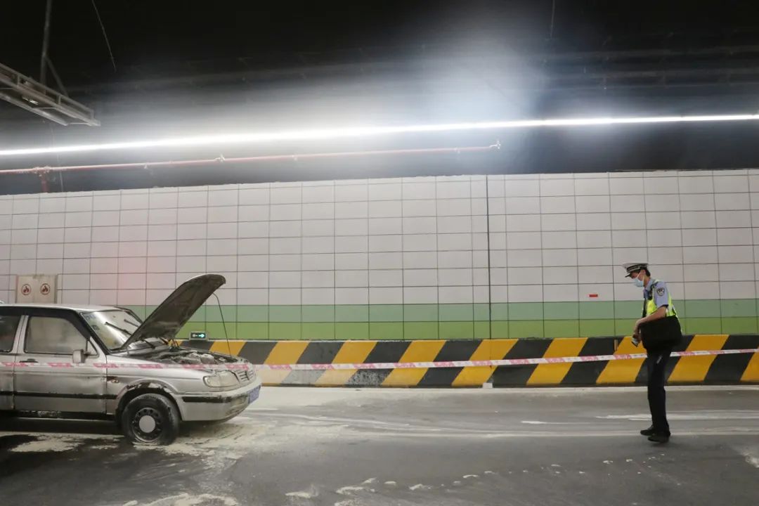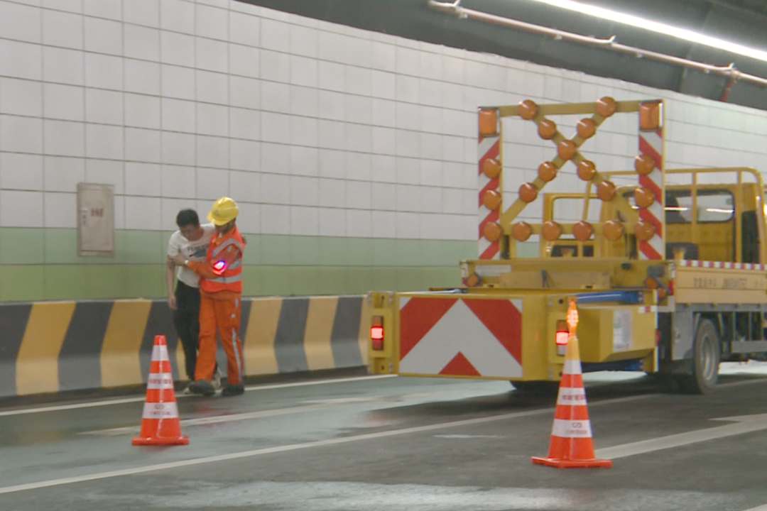 在发现车辆碰撞事故后,迅速在隧道口进行围蔽和疏导;