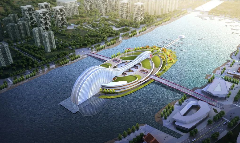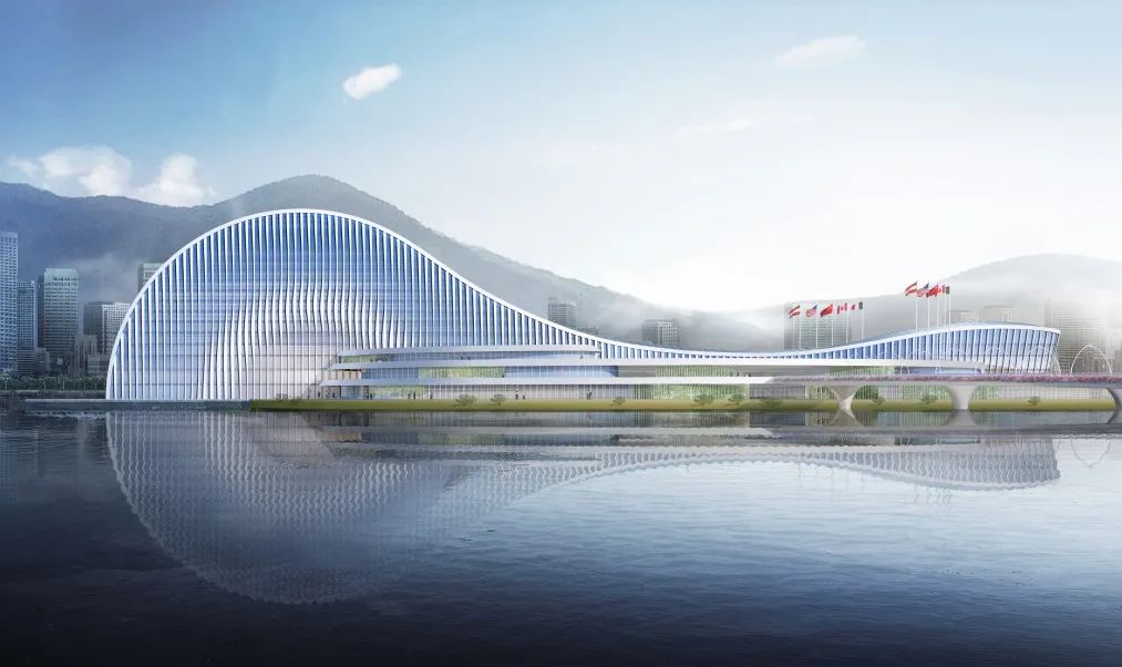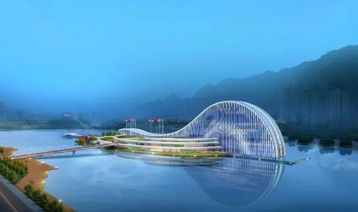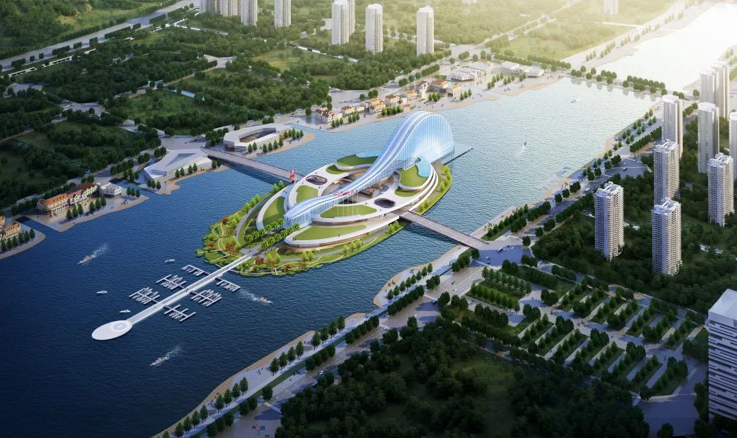 项目建筑设计以“映·韵”为设计理念,从横琴地名中获得创作源泉,汲取琵琶、古琴元素之灵感,将古琴的基本曲率抽象取形,形成建筑基本的曲线形体。从效果图上看,横琴天沐琴台外观建筑似一把横卧天沐河上的琵琶,在设计上采用了大跨度的超高空间、连续钢架屋顶结构以及巨大玻璃幕墙,以打造灵动的建筑曲线,形成连续开放的室外公共空间和活力街区。