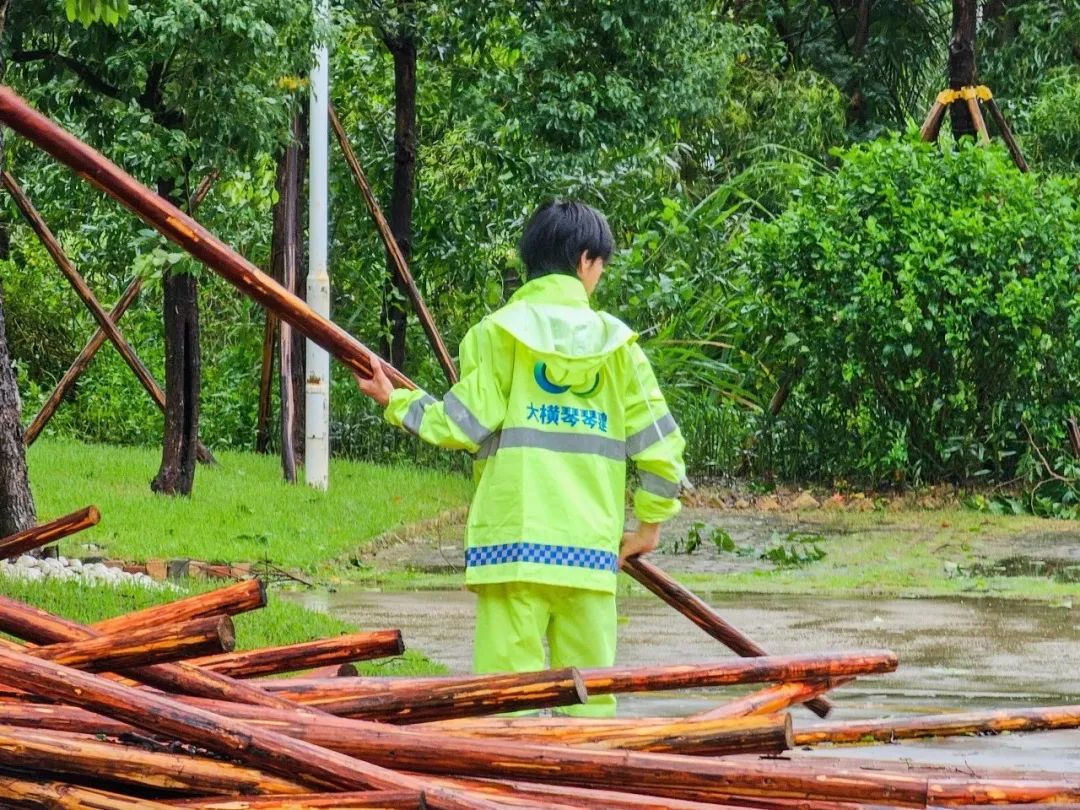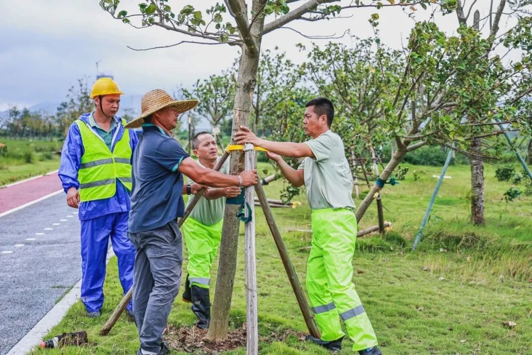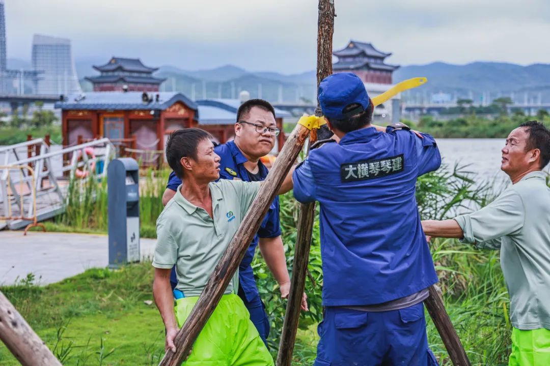 琴建公司管理人员全员上岗,对所管养的花海长廊、芒洲湿地公园、二井湾湿地公园、天沐河公园、各城市驿站、小横琴山步道、水库、沙滩等项目及在建工地进行防台风工作。