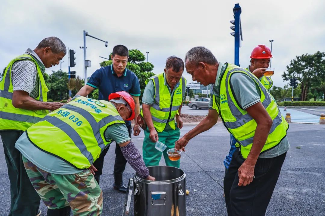 在抢险救灾的同时,琴建公司为奋战在一线的员工提供防护装备和物资,确保员工在恶劣天气条件下做好防护,保障安全,并为各项目送去食物和姜茶。