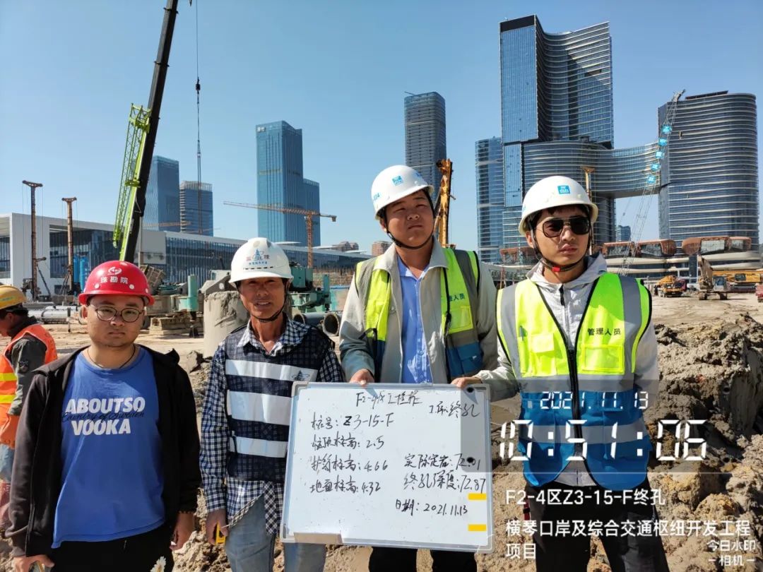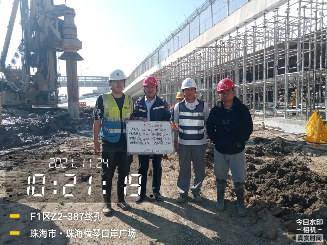 九是质量安全。成立质量管理小组,制定质量管理措施,按照公司安全管理规定,落实责任到人、层层把关,定期开展安全检查,兼顾突击检查,避免安全隐患。如对项目桩基础等重要工序,结合工程工序相关查验标准,全过程记录每条桩的超前钻、钢护筒、桩孔重要参数,并对不同数据互相比对,确保每道工序按图施工。2021年10月起,指挥部成员轮流值班,跟进每一条桩基终孔验收工作,并拍照留底。据统计,验桩共安排轮值共113次。