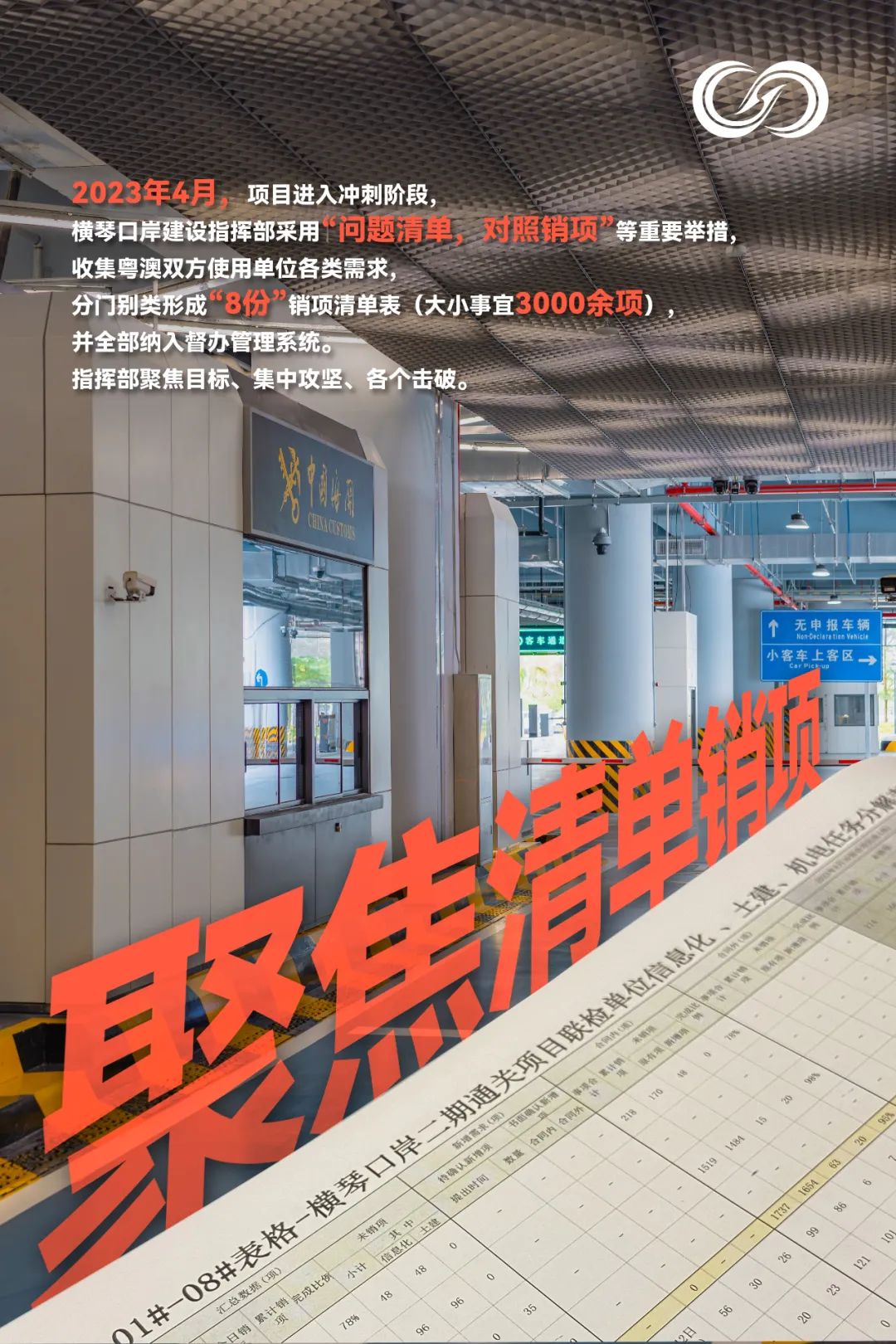 八是清单销项。口岸指挥部延续“5+2”、“白+黑”的工作模式,解决现场推进过程中遇到的实际问题,确保问题不过夜。冲刺阶段,更是坚持每天下午17:00组织参建单位召开工作协调推进会,重点梳理土建工程、信息化工程剩余工作推进情况、材料设备到场情况、质量问题整改情况等,形成8份销项表,包括粤方海关、粤方边检、澳方海关、澳方边检、澳方卫生局等需协调解决的问题,实行“问题清单销项督办”的机制,要求各责任人“锁定需求、对表作战,对照销项”。据统计,梳理大小问题多达3000余项。