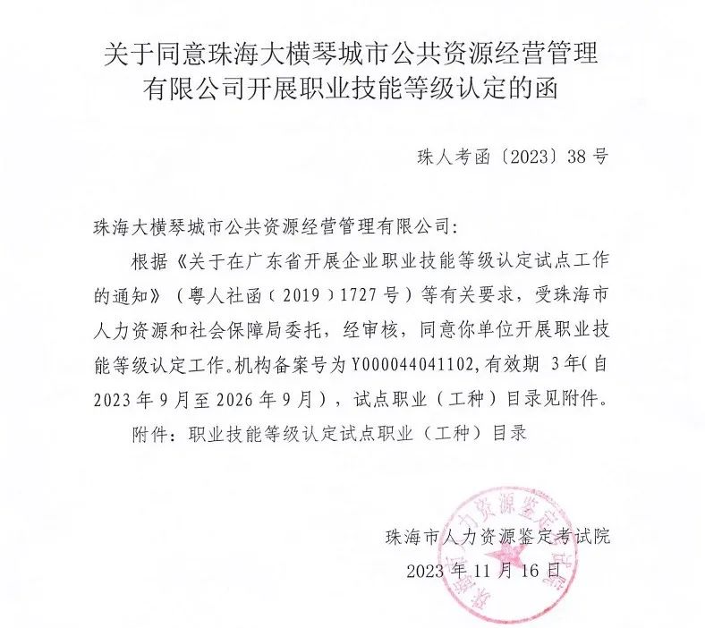 通过该项备案申请后,当前,大横琴城资可面向公司职工组织开展职业技能等级认定工作,包括评价规范的制定、评价的方式、指标的设定、具体的实施、认定公示和证书的核发等。