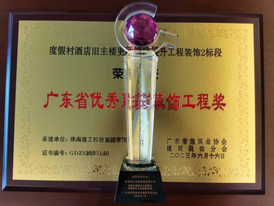 度假村酒店旧主楼更新修缮提升工程装饰2标段荣获全国建筑工程装饰奖、广东省优秀建筑装饰工程奖、珠海市优秀建筑装饰工程奖。