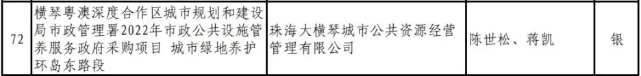 喜讯,2023年度,广东省风景园林与生态景观协会科学技术奖(园林工程奖)评选日前落幕,五楼自拍 城市公共资源经营管理有限公司(以下简称大横琴城资)管养的横琴粤澳深度合作区城市规划和建设局市政管理署2022年市政公共设施管养服务政府采购项目——城市绿地养护环岛东路段荣获养护类银奖。