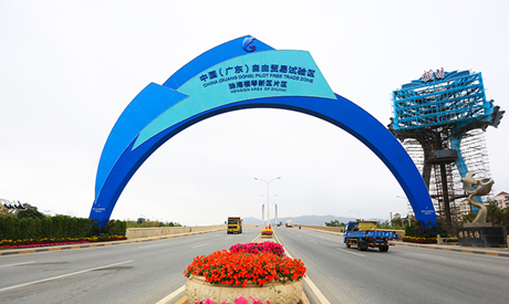 广东自贸区珠海横琴新区片区拱门已基本完成。3月2日,记者在珠海市区通往横琴岛方向的横琴大桥上看到,自贸区横琴新区片区拱门主体结构已基本建成,拱门上醒目地写着“中国(广东)自由贸易试验区珠海横琴新区片区”几个大字,标志着再往前就将踏入即将挂牌成立的自贸区横琴新区片区。