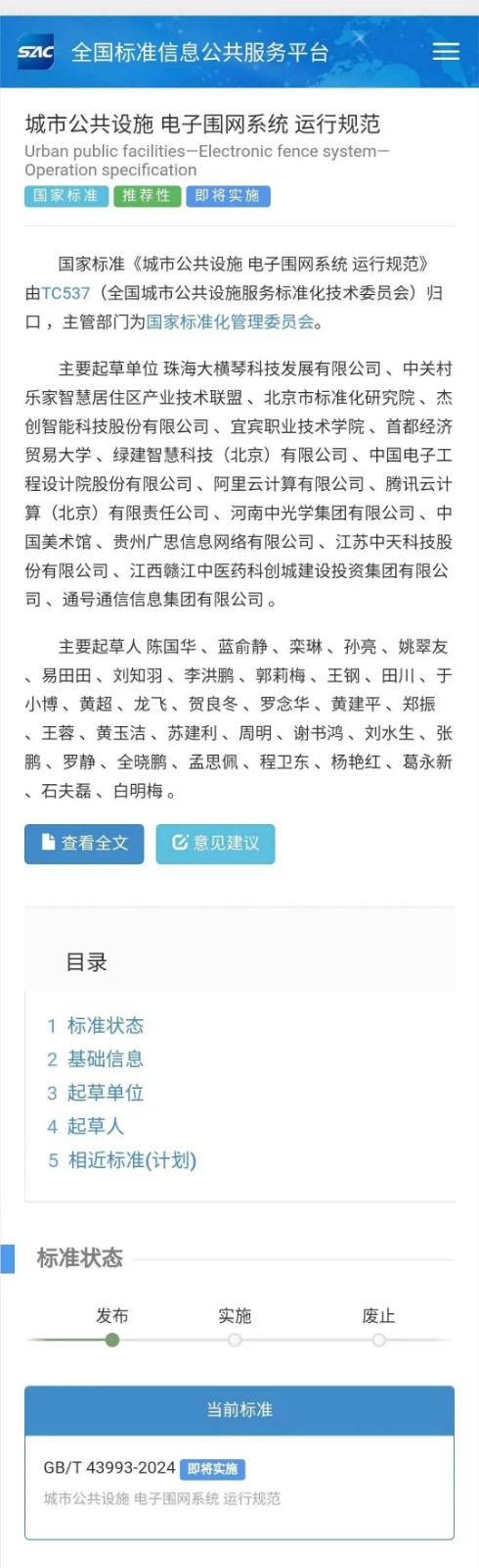 GB/T 43993-2024《城市公共设施 电子围网系统 运行规范》于2021年12月立项,由大横琴科技公司主导制定,TC537全国城市设施服务标准化技术委员会提供指导。标准制定工作组经过深度场景调研、密集专题讨论、广泛征求意见、严格技术审查,历经两年研制周期,最终确立了电子围网系统运行架构,明确了运行总体原则,并对电子围网系统的运行资源、运行服务、运行评价改进进行了全面规范化。该标准于2024年4月25日正式发布,并于2024年11月1日起正式实施。