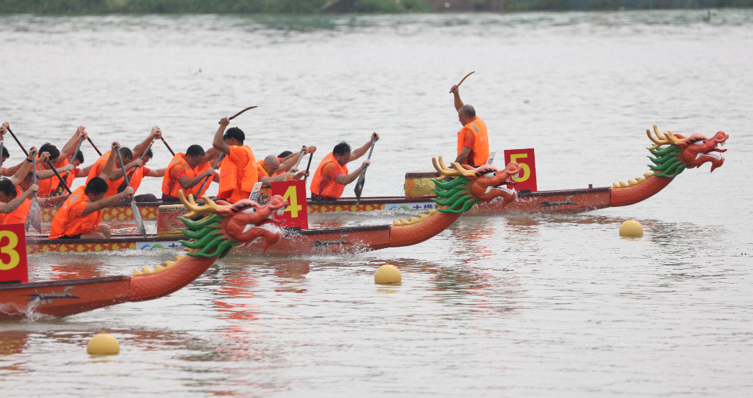 “哔!”发令声响,比赛正式开始。一条条龙舟破水而出,沿着600米的赛道,各组队伍奋力挥桨、劈波斩浪,在一声声呐喊中奋勇向前,激起层层浪花。