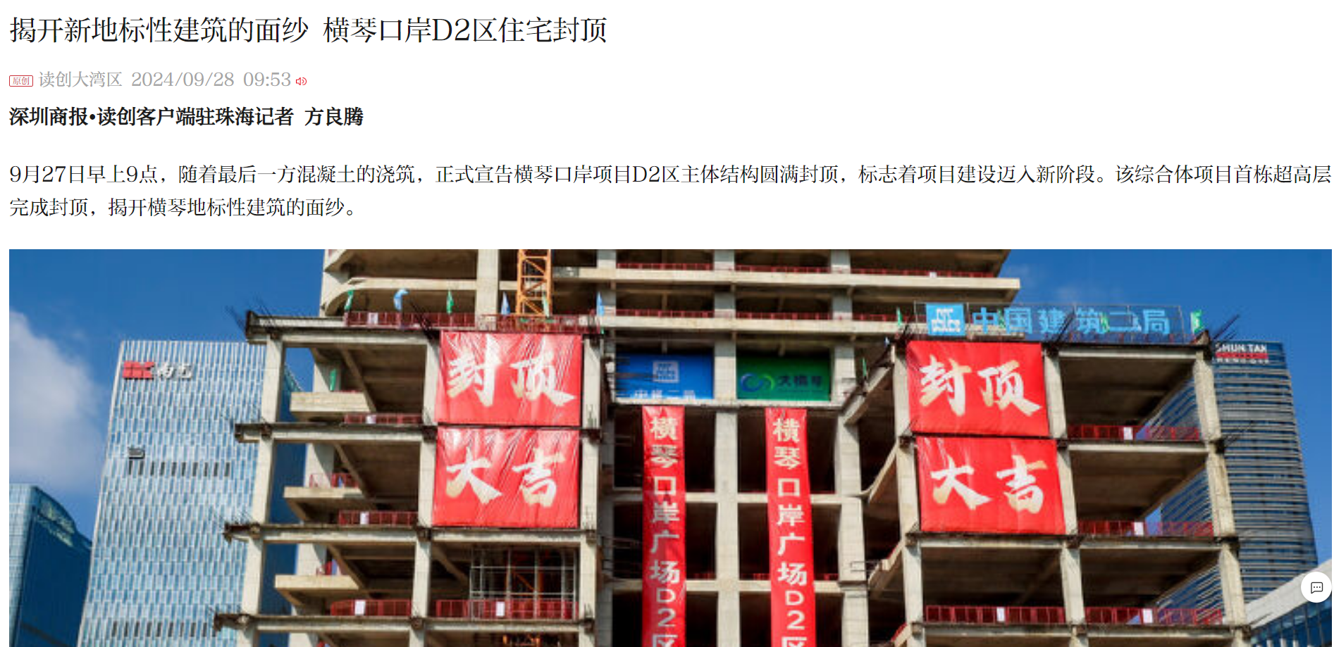 9月27日早上9点,随着最后一方混凝土的浇筑,正式宣告横琴口岸项目D2区主体结构圆满封顶,标志着项目建设迈入新阶段。该综合体项目首栋超高层完成封顶,揭开横琴地标性建筑的面纱。