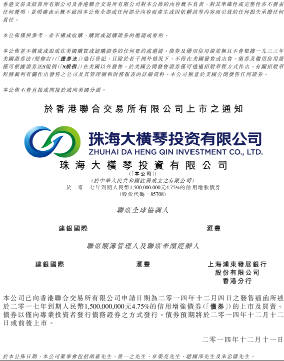 大横琴投资有限公司债券于 香 港 联 合 交 易 所 有 限 公 司 上 市 之 通 知